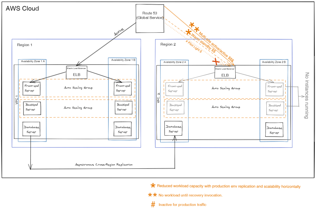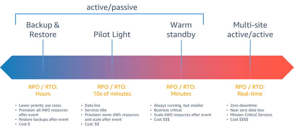 - Backup & Restore – Most cost effective solution. But is time consuming. Longer down times and poorer RTOs. Alongside of backing the data up to prevent any data loss, the infrastructure, configurations, and app code need to be deployed on the recovery region, which is time consuming. And has to be done to result in a same setup as that of the original Region. Hence, Infrastructure as a Code is the best way to get a repeatable infrastructure.